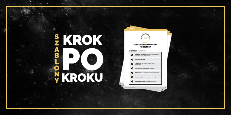 Expert Generowania Klientów - nauczysz się, gdzie i jak szybko pozyskiwać klientów. Pokażę Ci 7 metod, które nie wymagają inwestycji w działania marketingowe, a równocześnie dające Ci możliwość budowania nigdy nie kończącej się bazy, dzięki czemu nie będziesz więcej miał poczucia, że brakuje Ci potencjalnych klientów. Każdą z tych metod poznasz krok po kroku łącznie z instrukcjami i schematami komunikacji.